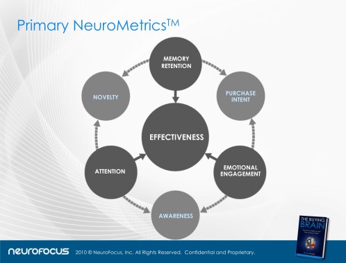 The five major areas of neuromarketing practice at Nielsen NeuroFocus are brands, products, packaging, advertising and in-store marketing. NeuroFocus has developed three primary NeuroMetrics (they measure measure Attention, Emotional Engagement, and Memory), three derived NeuroMetrics (Purchase Intent / Persuasion, Novelty, and Awareness / Understanding / Comprehension), and one summary NeuroMetric (Effectiveness). Another more general methodology that they use is called Deep Subconscious Response (DSR).